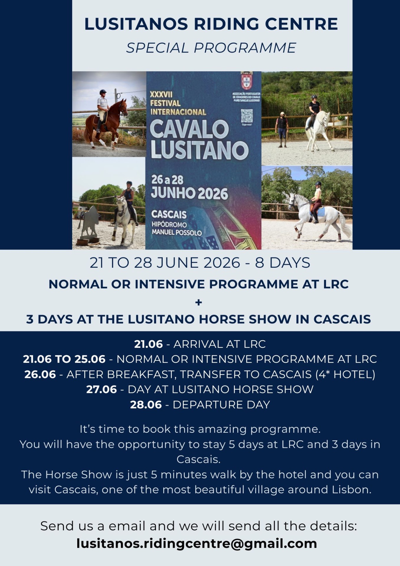 26 January to 1 February you can stay with us and our Lusitanos, choose Dressage or WE lessons and visit the Lusitano Horse Show in Lisbon where you can see the Best Stallions, Dressage and WE Competitions and enjoy the beautiful Lusitanos around!!!
